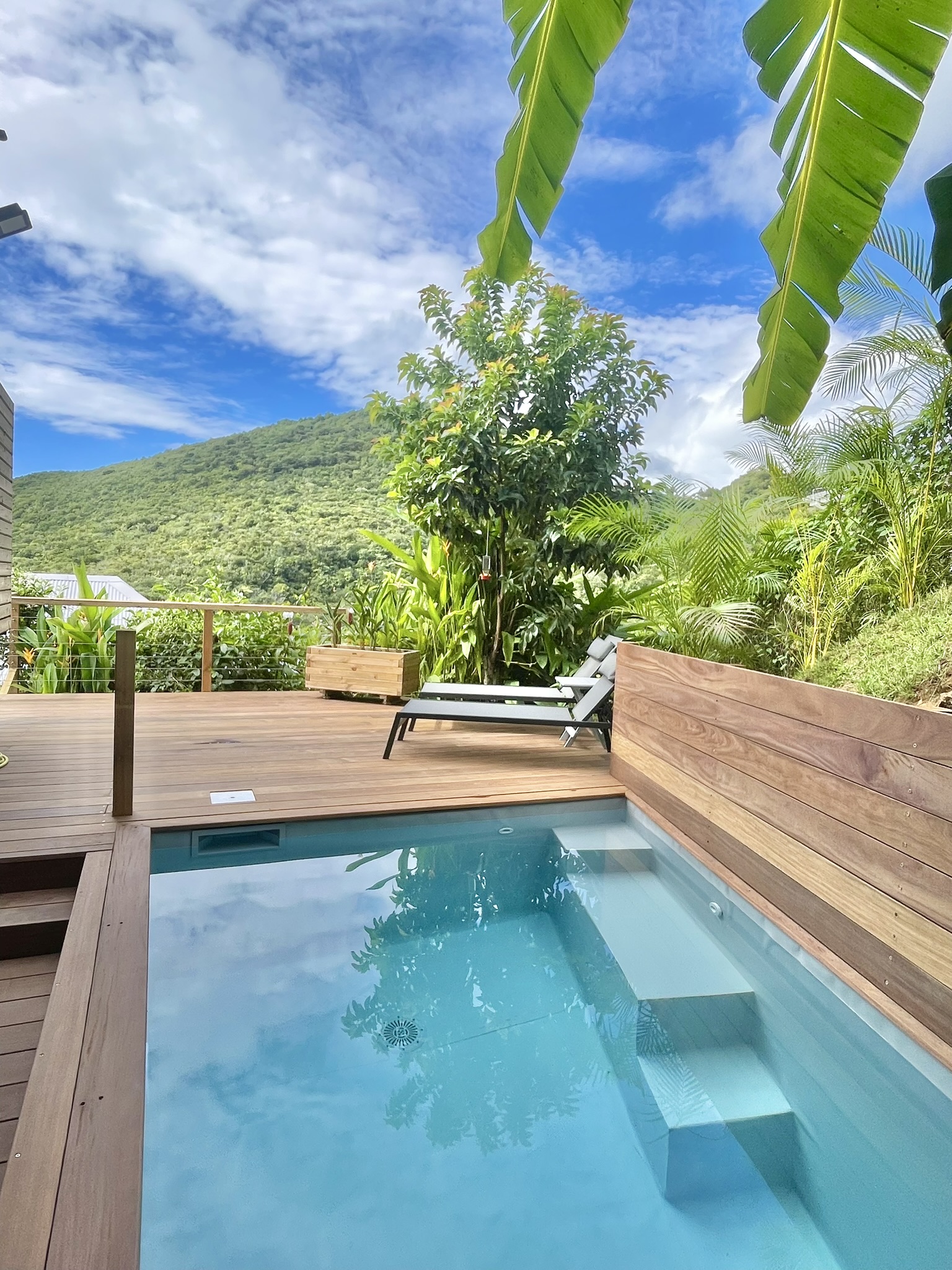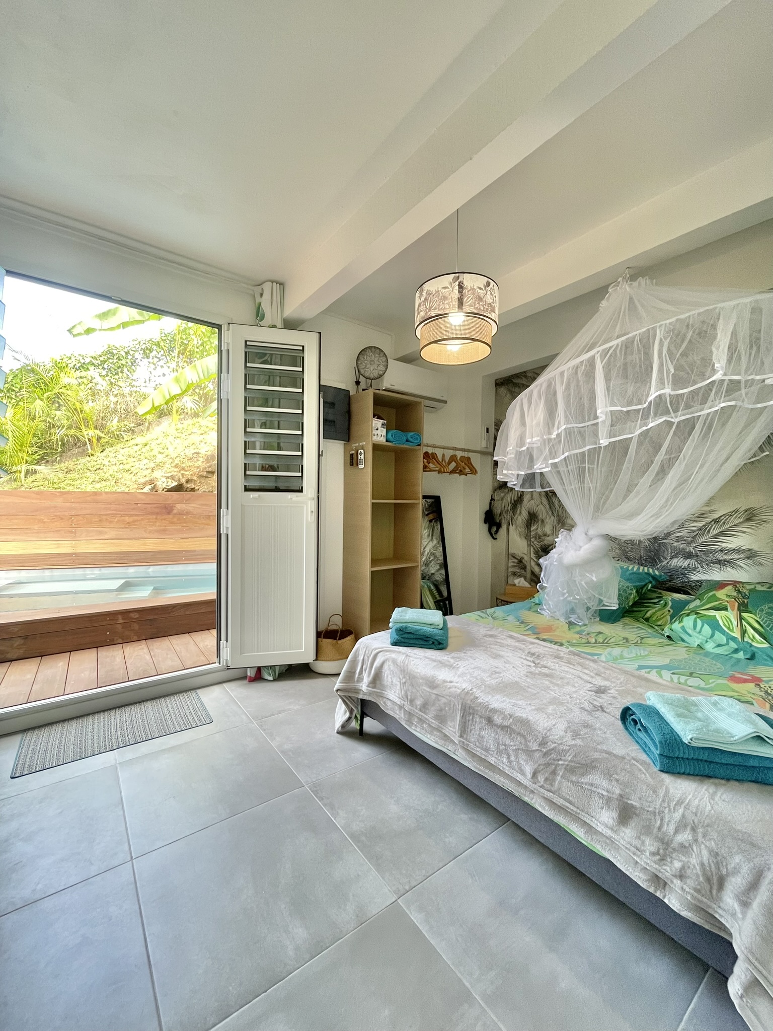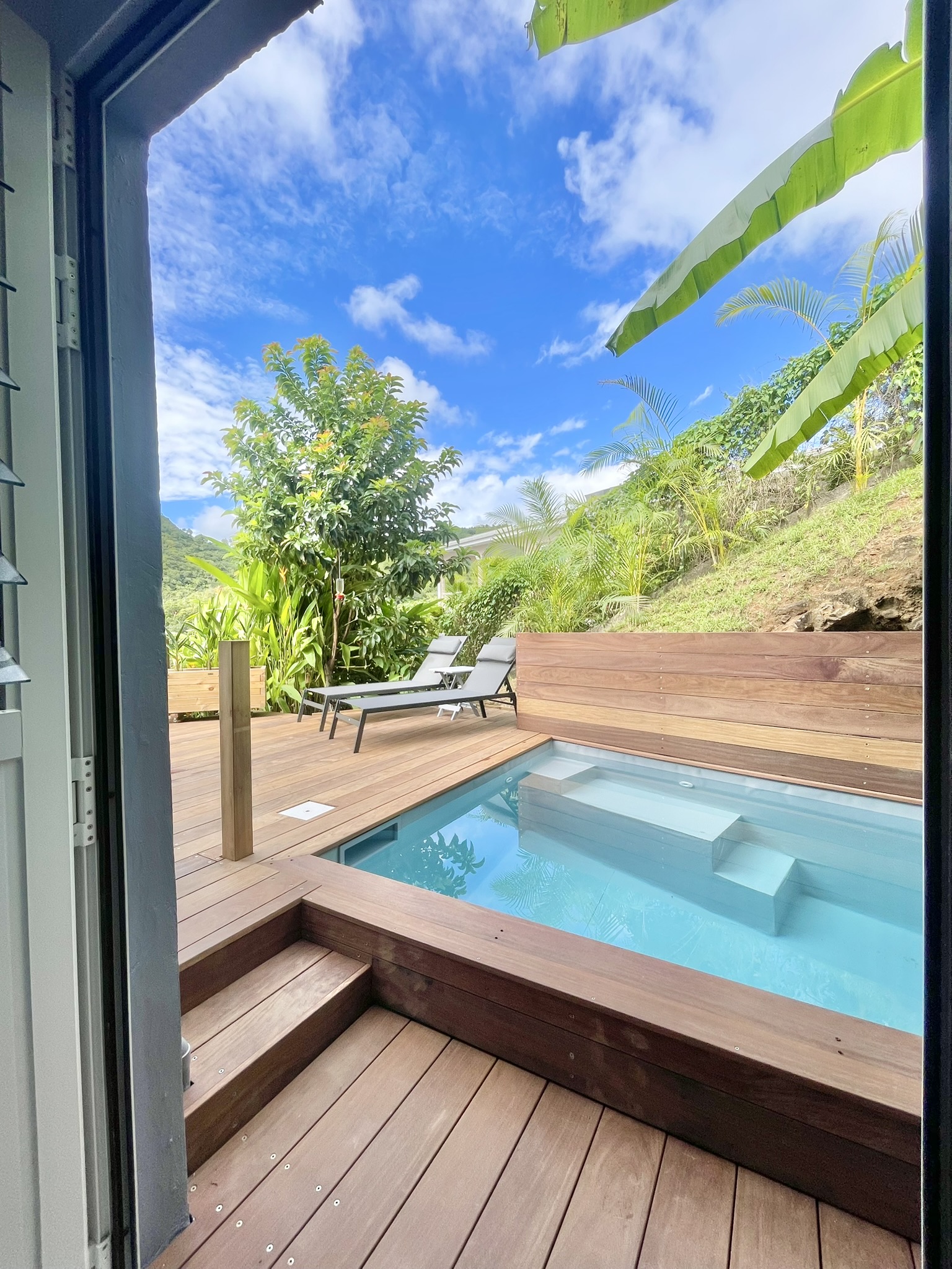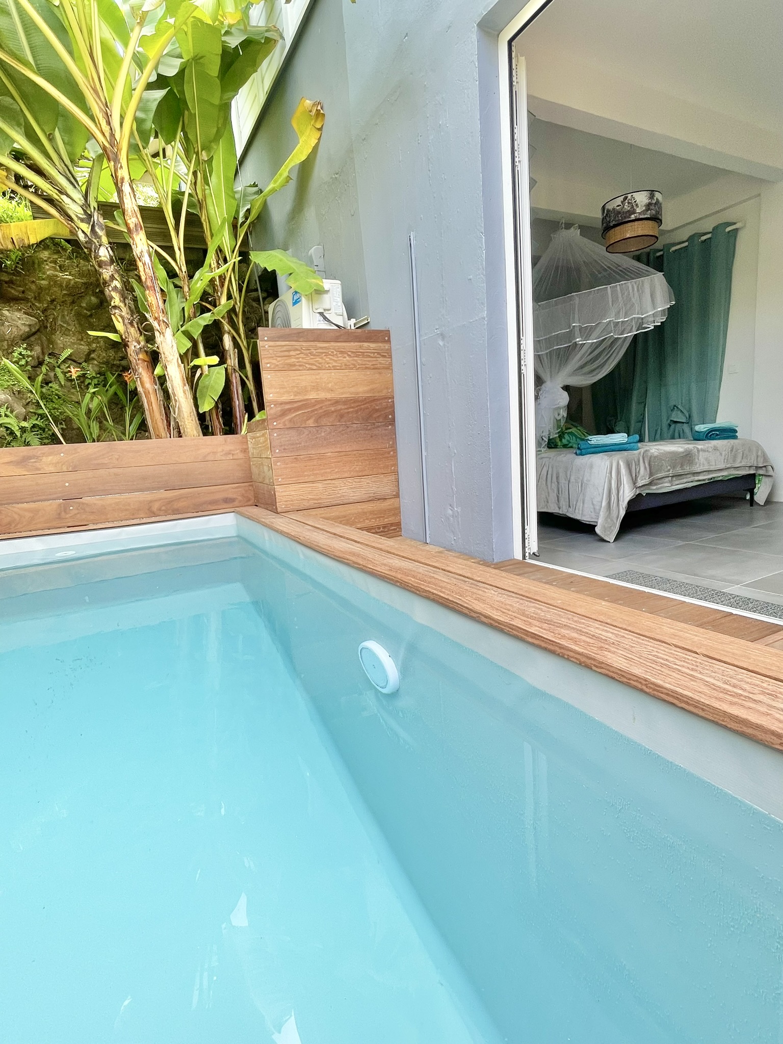 From the bedroom, a glass door opens directly onto a private pool and its deck. Nestled in a lush tropical garden, the pool blends harmoniously into the landscape, where hummingbirds flutter about, adding an exotic touch to your stay.