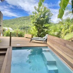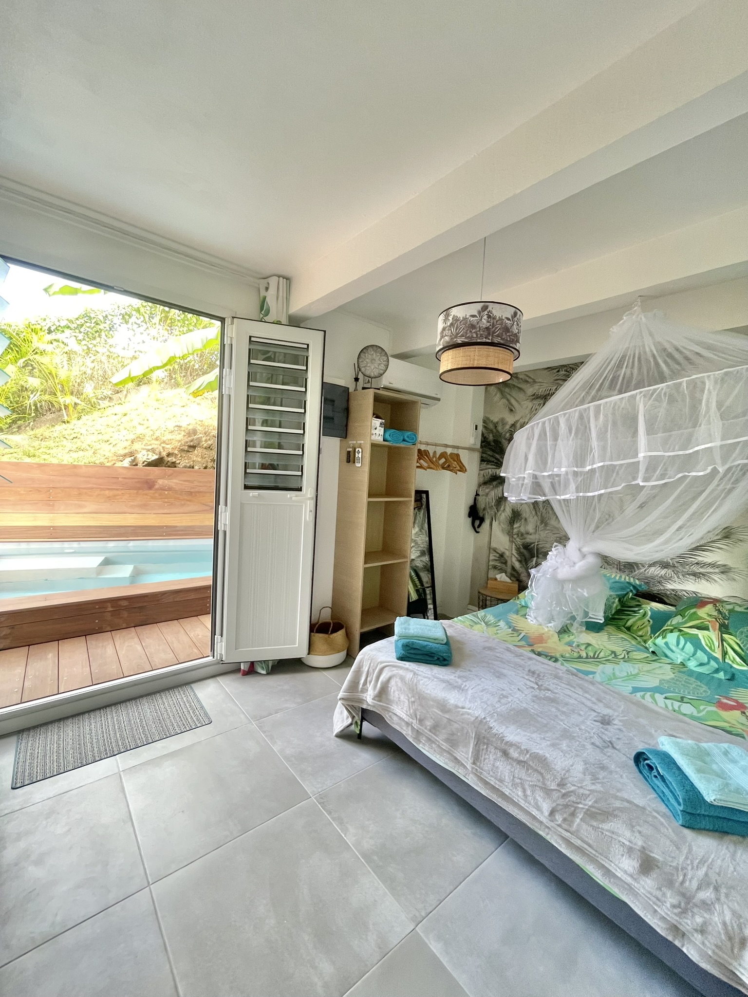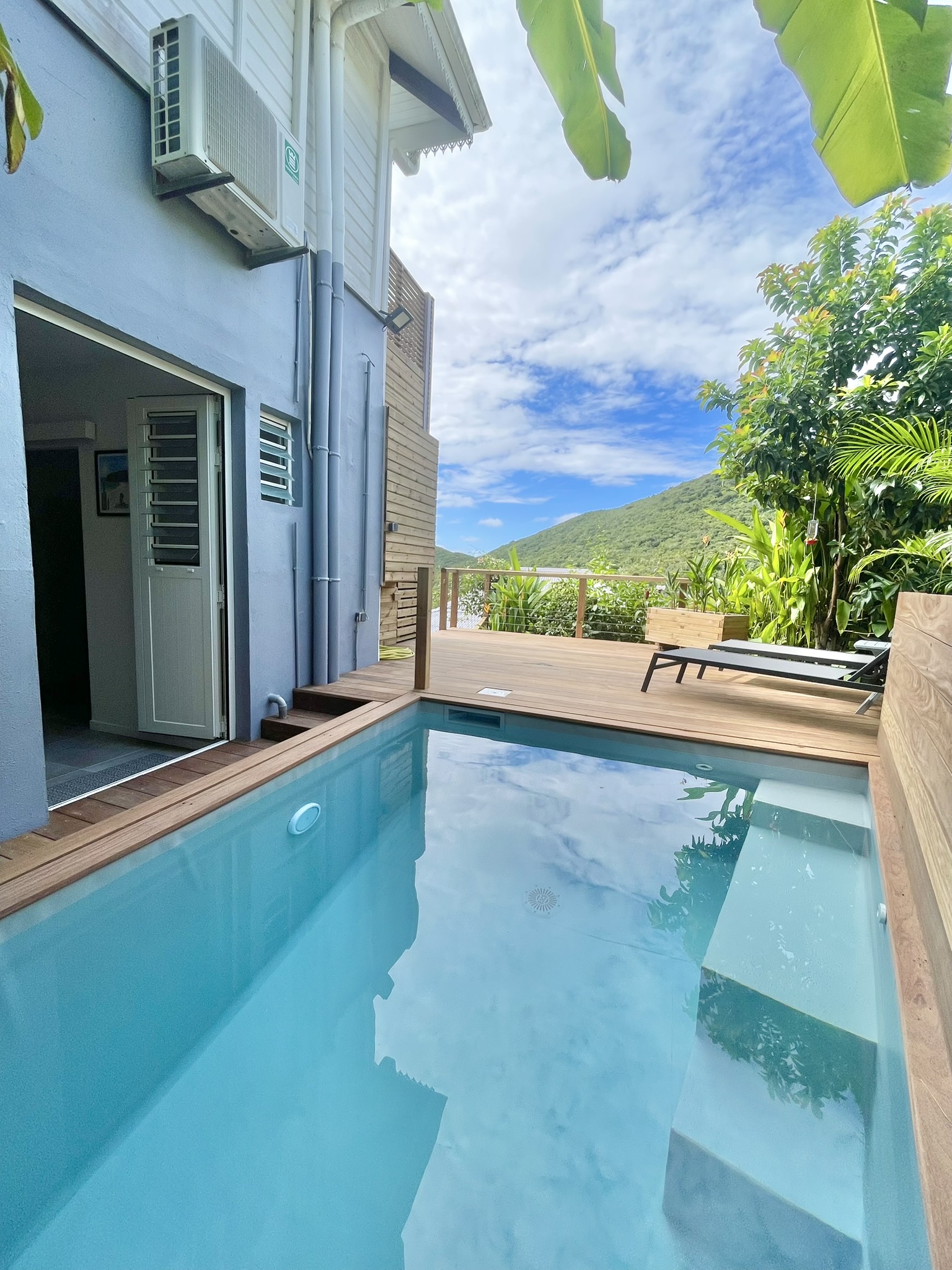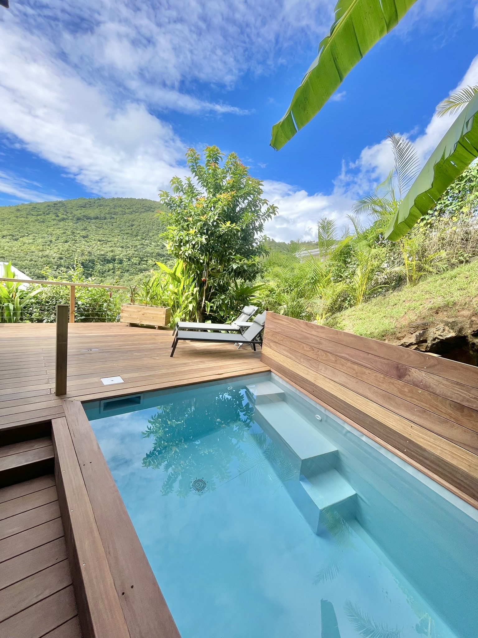 From the bedroom, a glass door opens directly onto a private pool and its deck. Nestled in a lush tropical garden, the pool blends harmoniously into the landscape, where hummingbirds flutter about, adding an exotic touch to your stay.