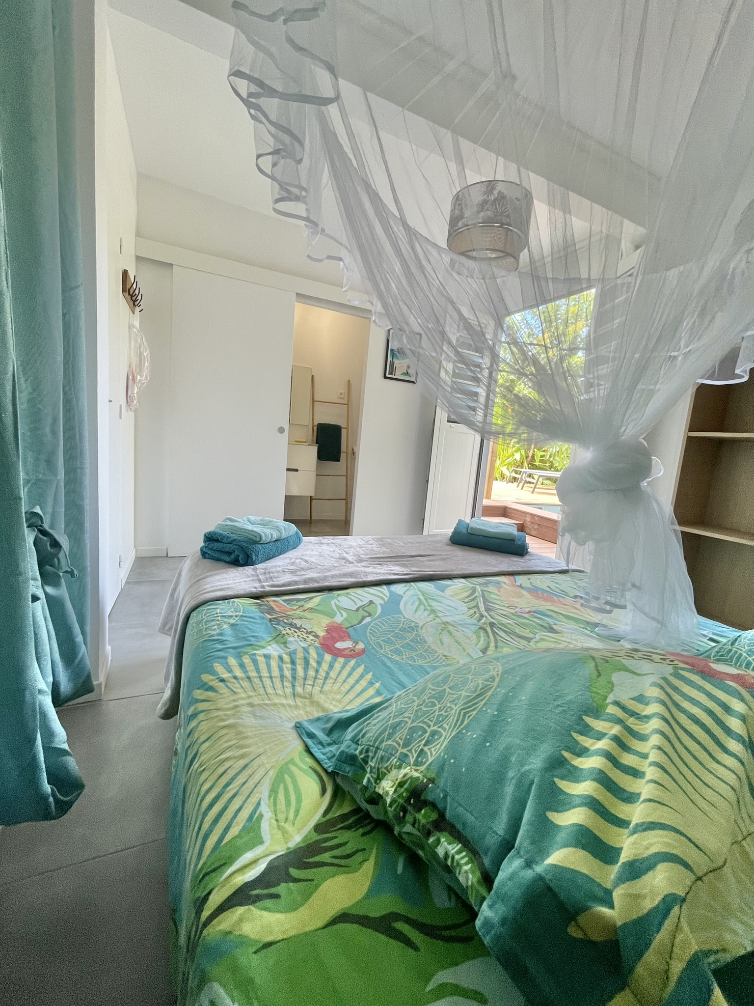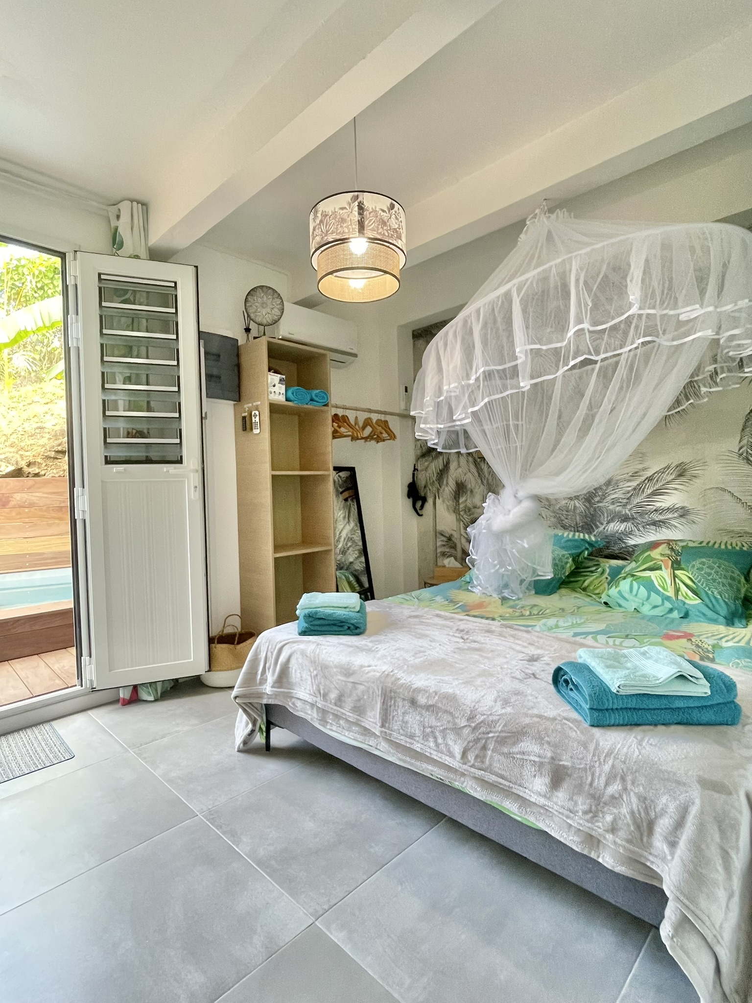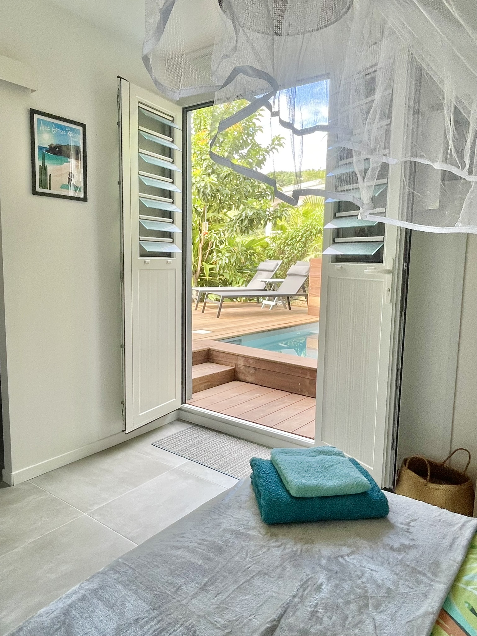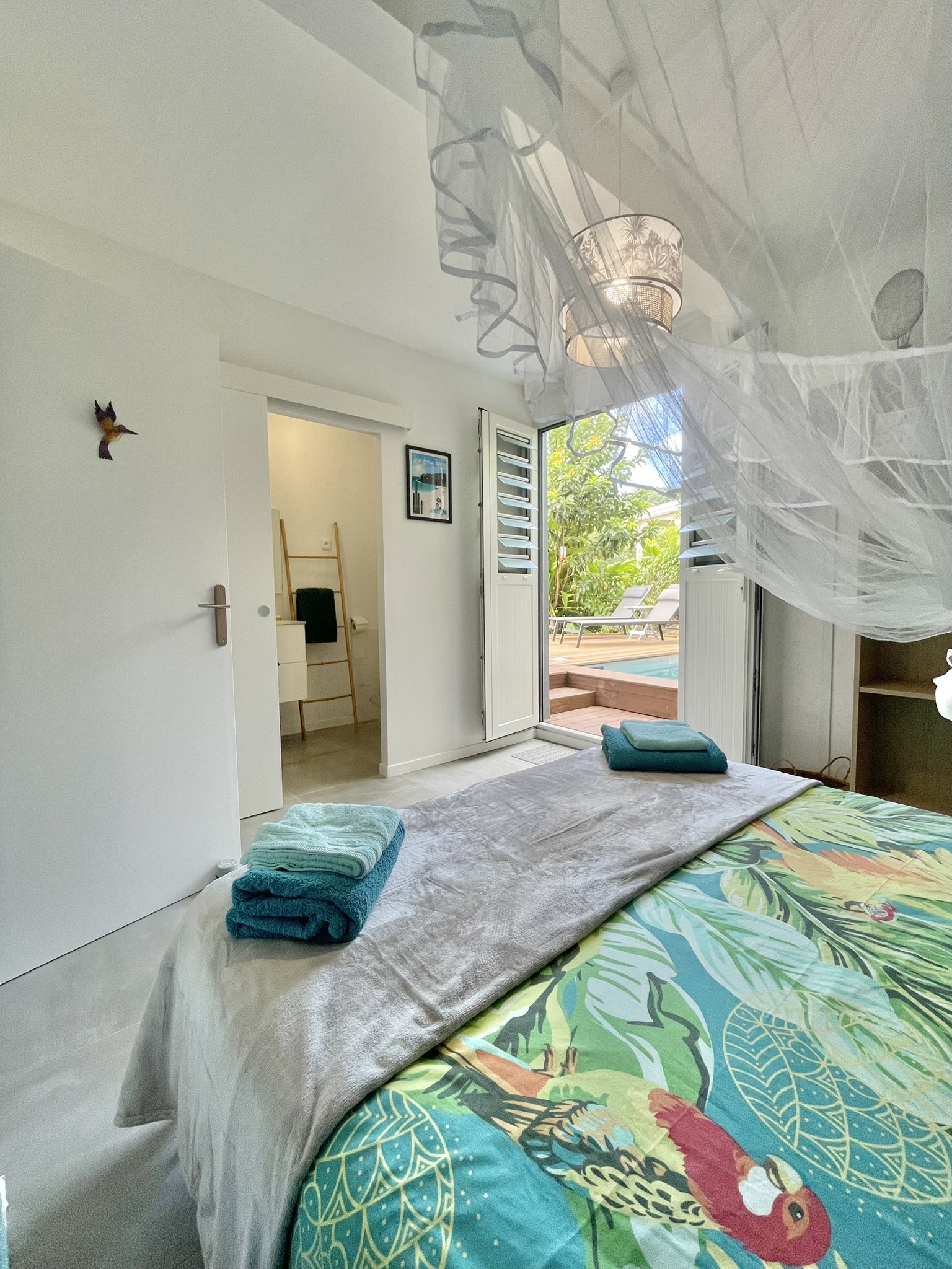 From the bedroom, a glass door opens directly onto a private pool and its deck. Nestled in a lush tropical garden, the pool blends harmoniously into the landscape, where hummingbirds flutter about, adding an exotic touch to your stay.
