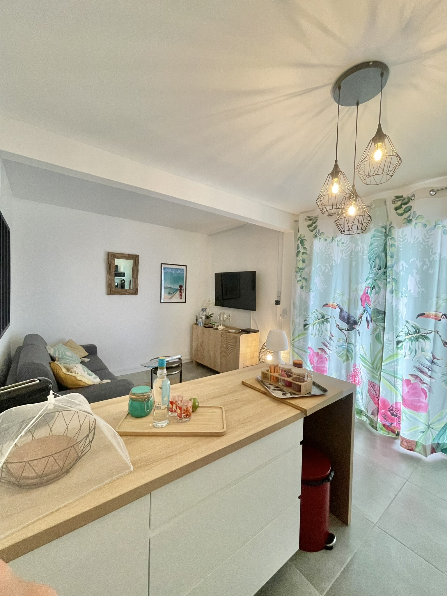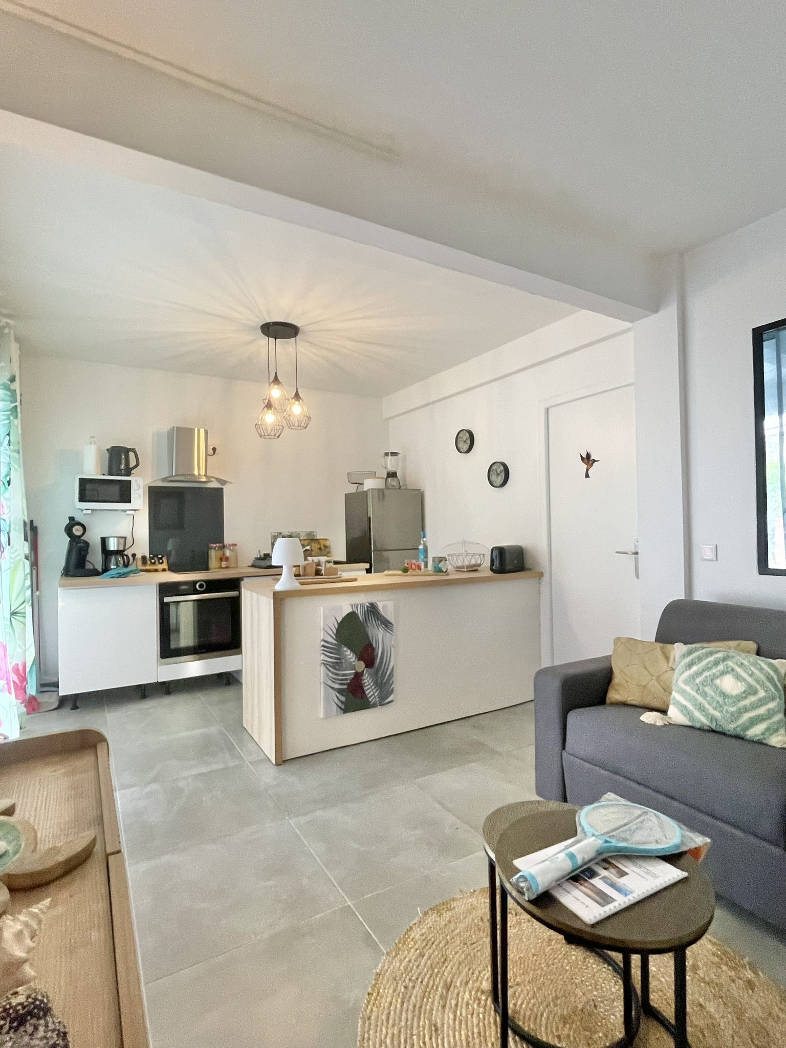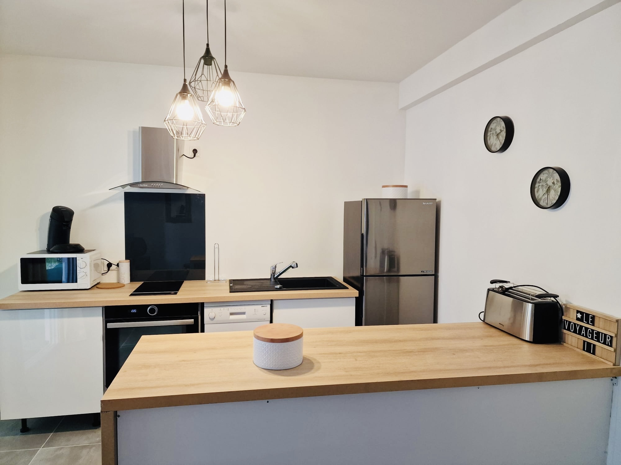 A Beautiful kitchen area equipped with high-quality appliances: Dishwasher, oven, vitroceramic cooktop, rang hood, combination fridge-freezer, microwave, filter coffee maker and Senseo, Kettle, toaster, and a large central worktop. The kitchen opens onto a comfortable, well-appointed living room area: sofa, coffee table, TV unit and TV.