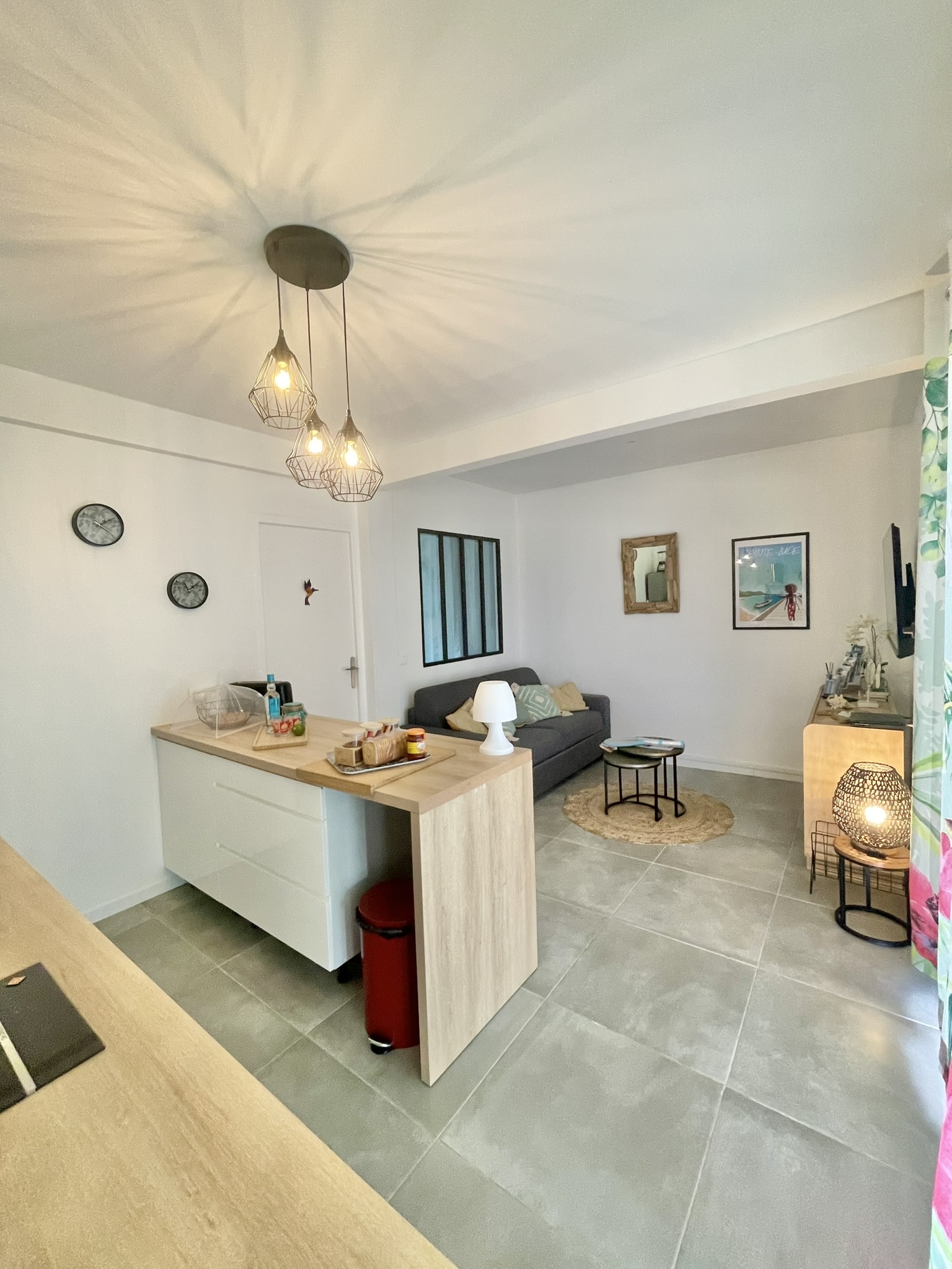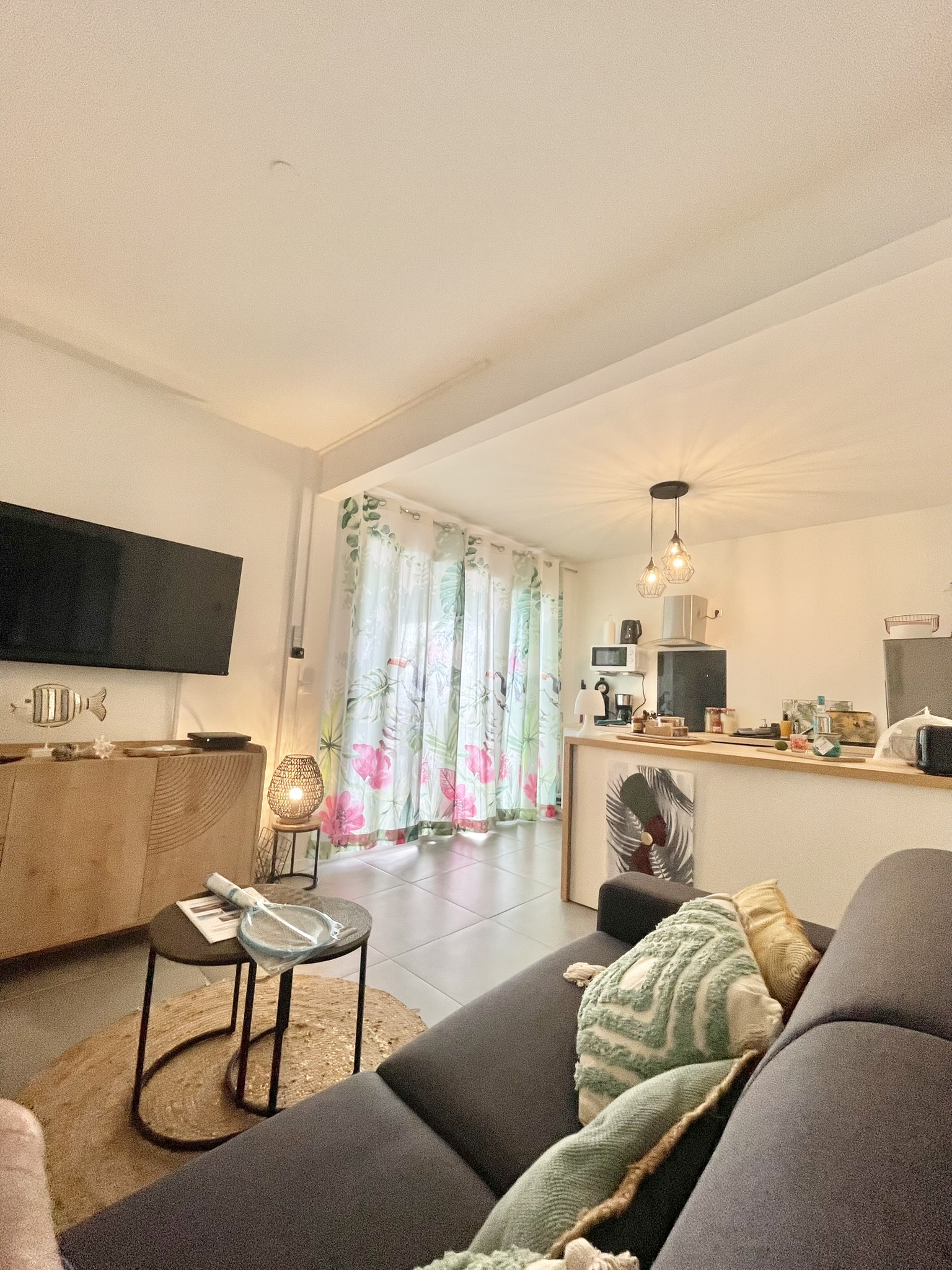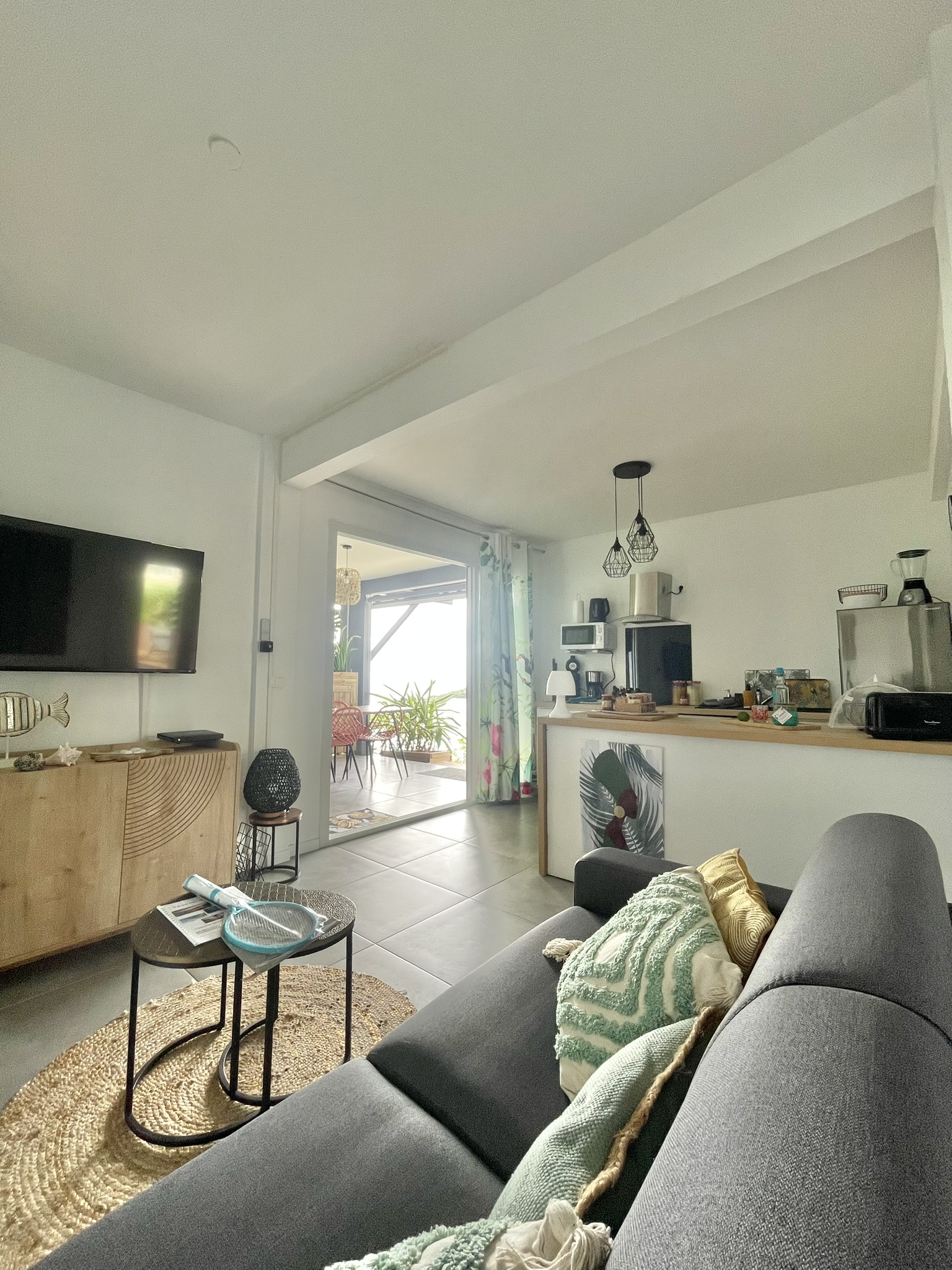 A Beautiful kitchen area equipped with high-quality appliances: Dishwasher, oven, vitroceramic cooktop, rang hood, combination fridge-freezer, microwave, filter coffee maker and Senseo, Kettle, toaster, and a large central worktop. The kitchen opens onto a comfortable, well-appointed living room area: sofa, coffee table, TV unit and TV.