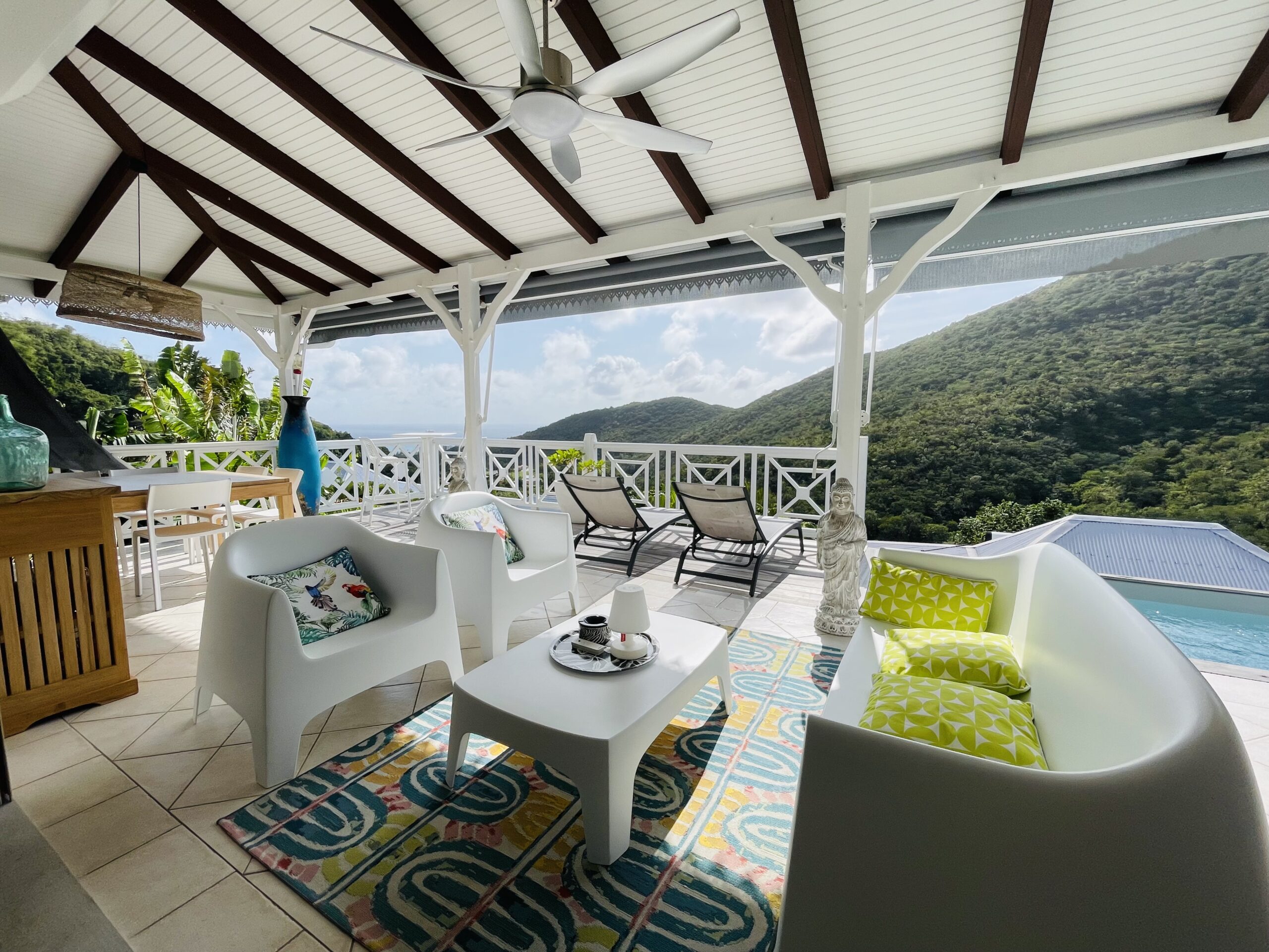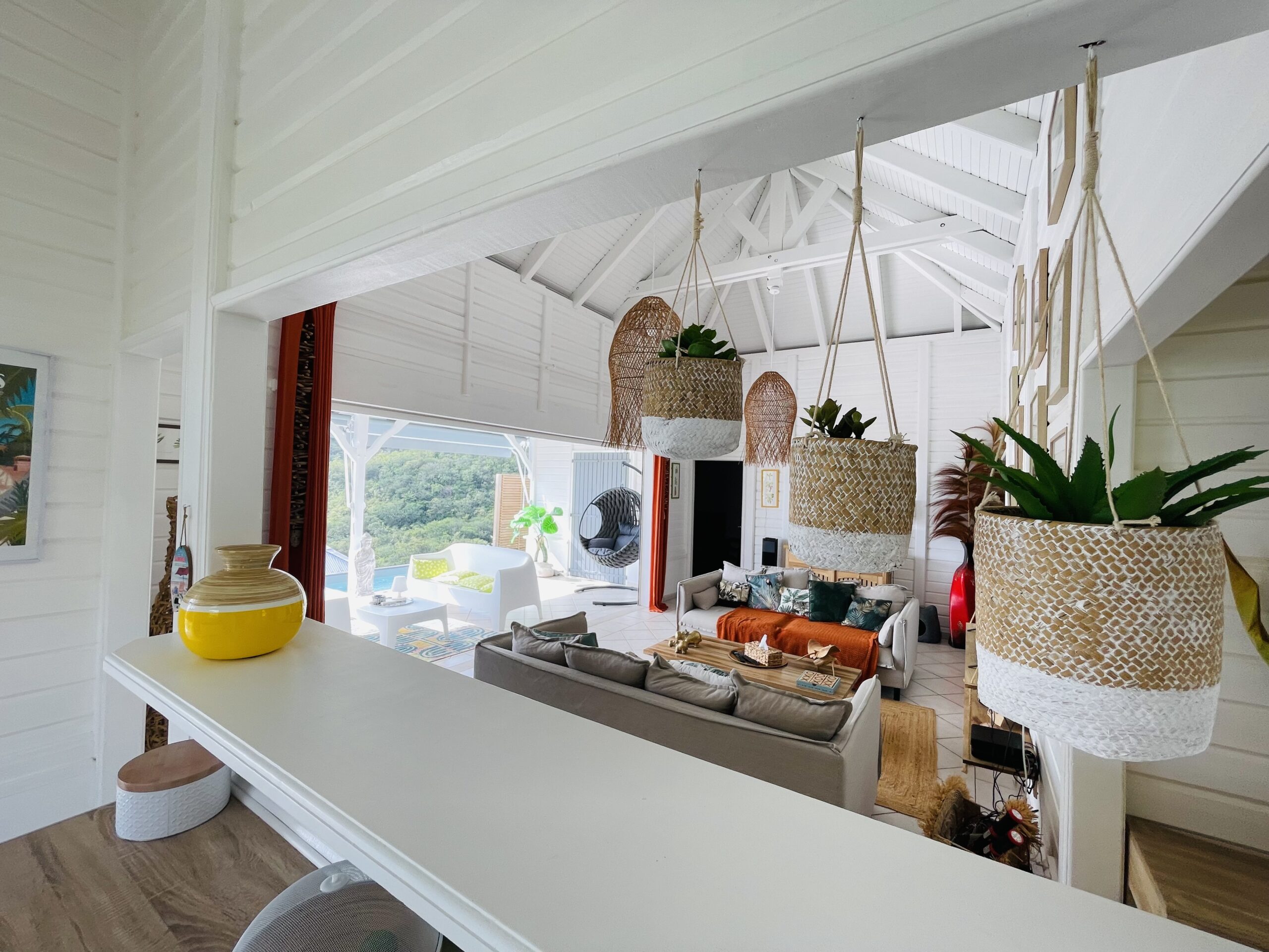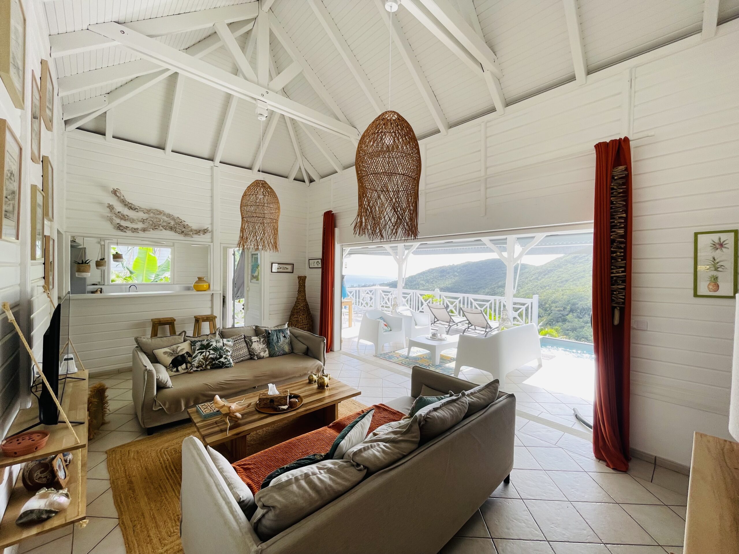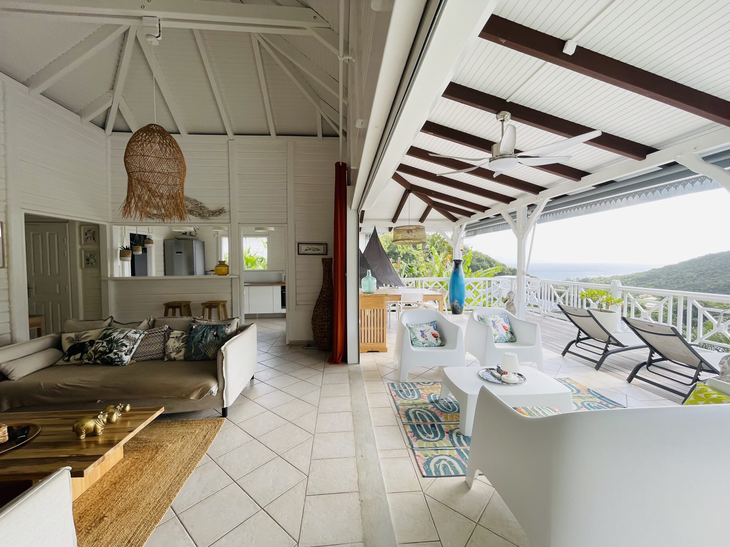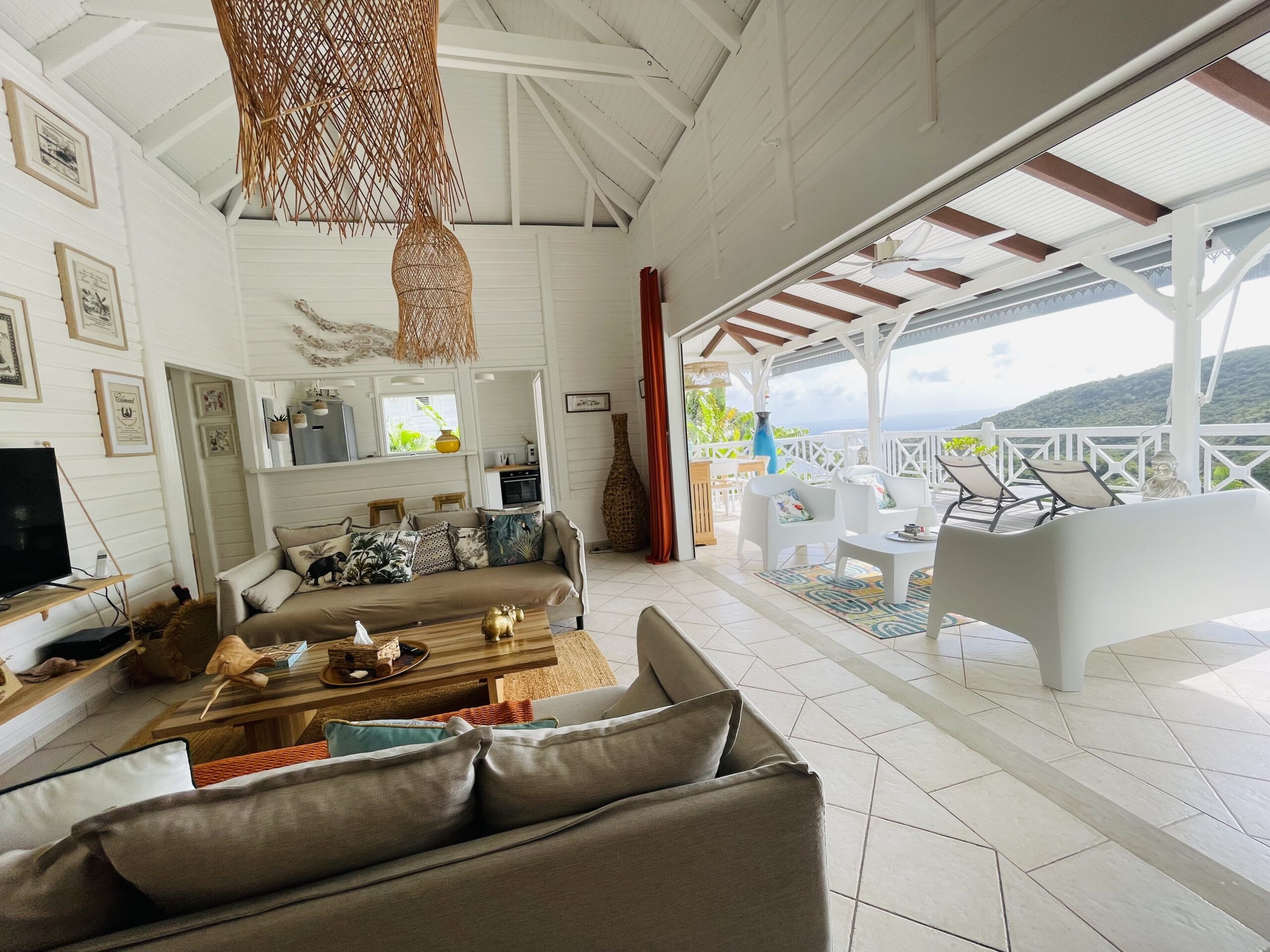 oom with its large opening onto the terrace which will offer you a panoramic view of the sea and the wooded hills, you can relax there on two comfortable fabric sofas while enjoying its cozy atmosphere. A second lounge equipped with armchairs invites you to sip a ti-punch or a local fruit juice as close as possible to this captivating view where the shades of green of the hills and blue of the sea mix, to satisfy your desire for relaxation a another “hanging egg” armchair awaits you there for even more comfort.