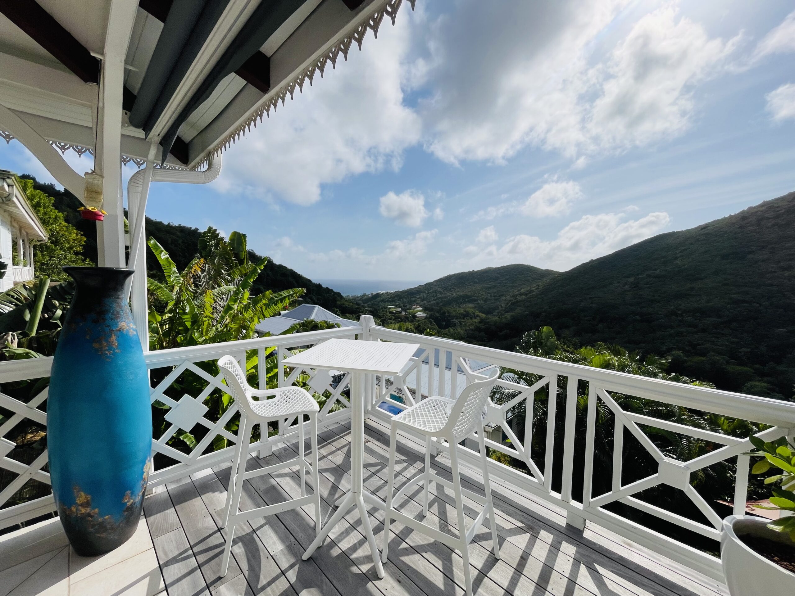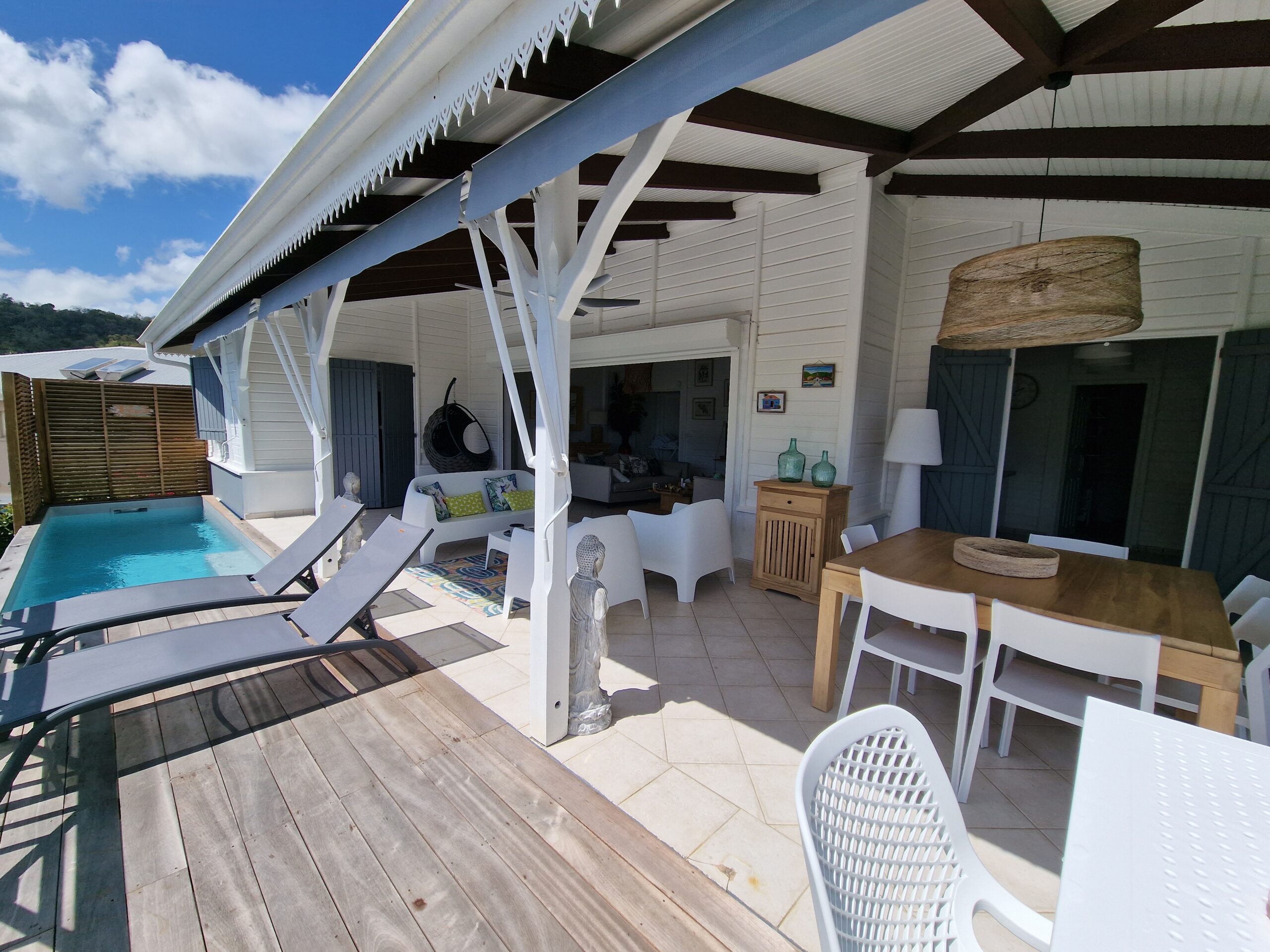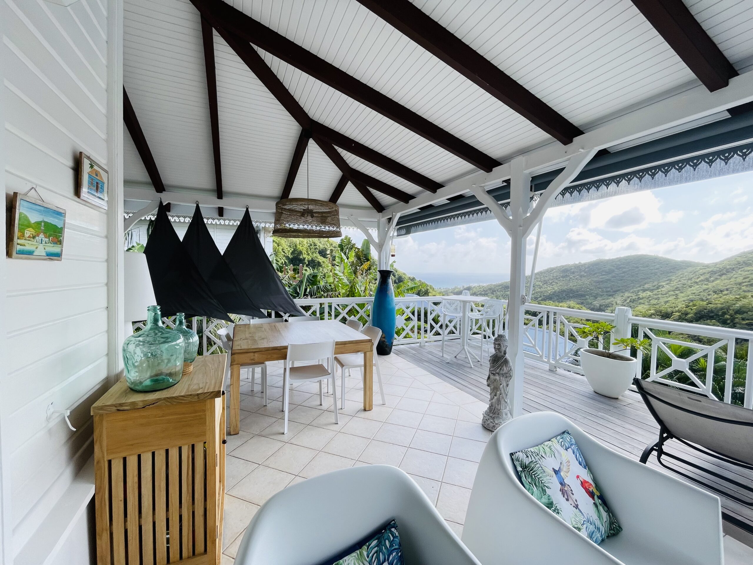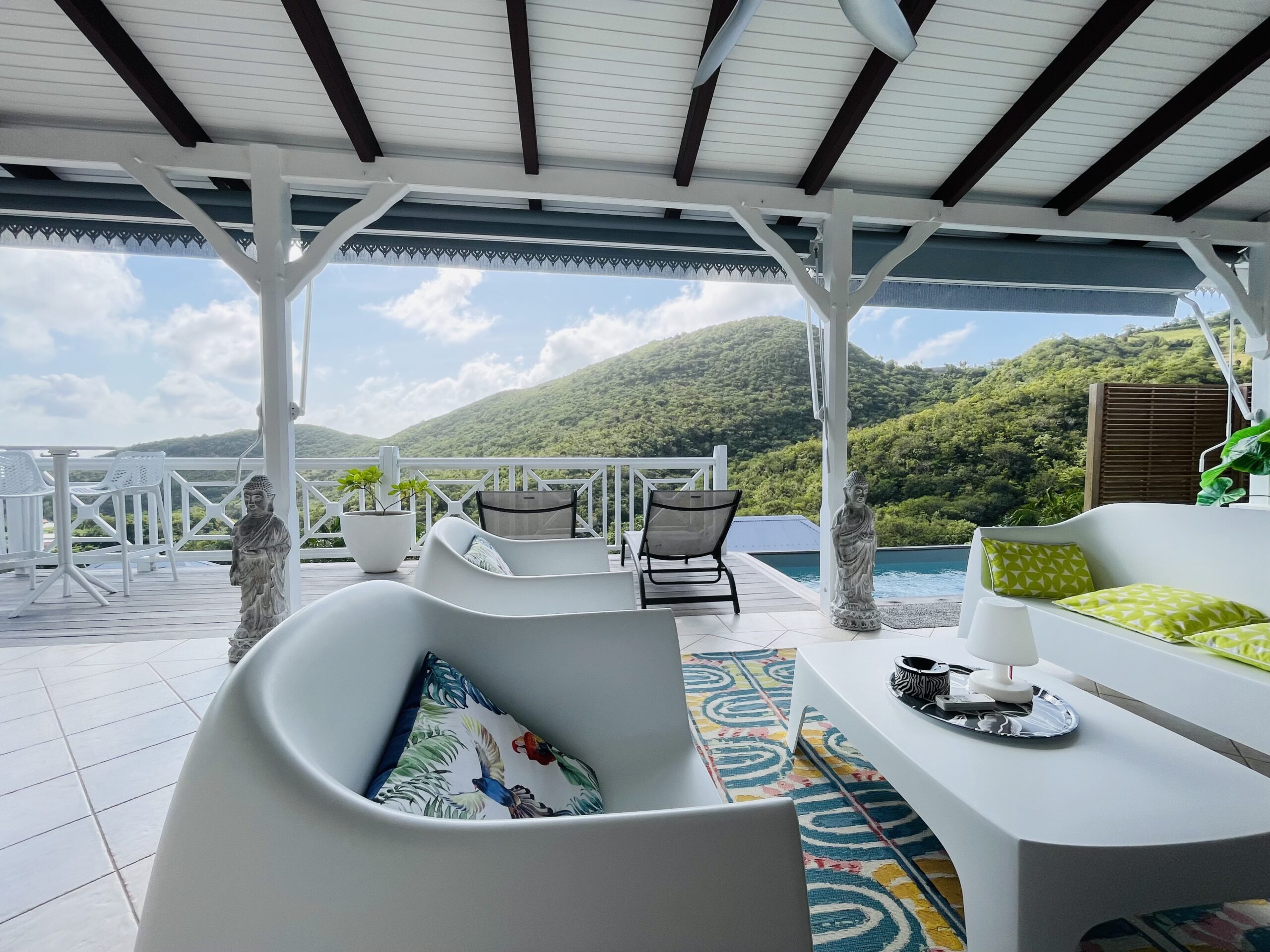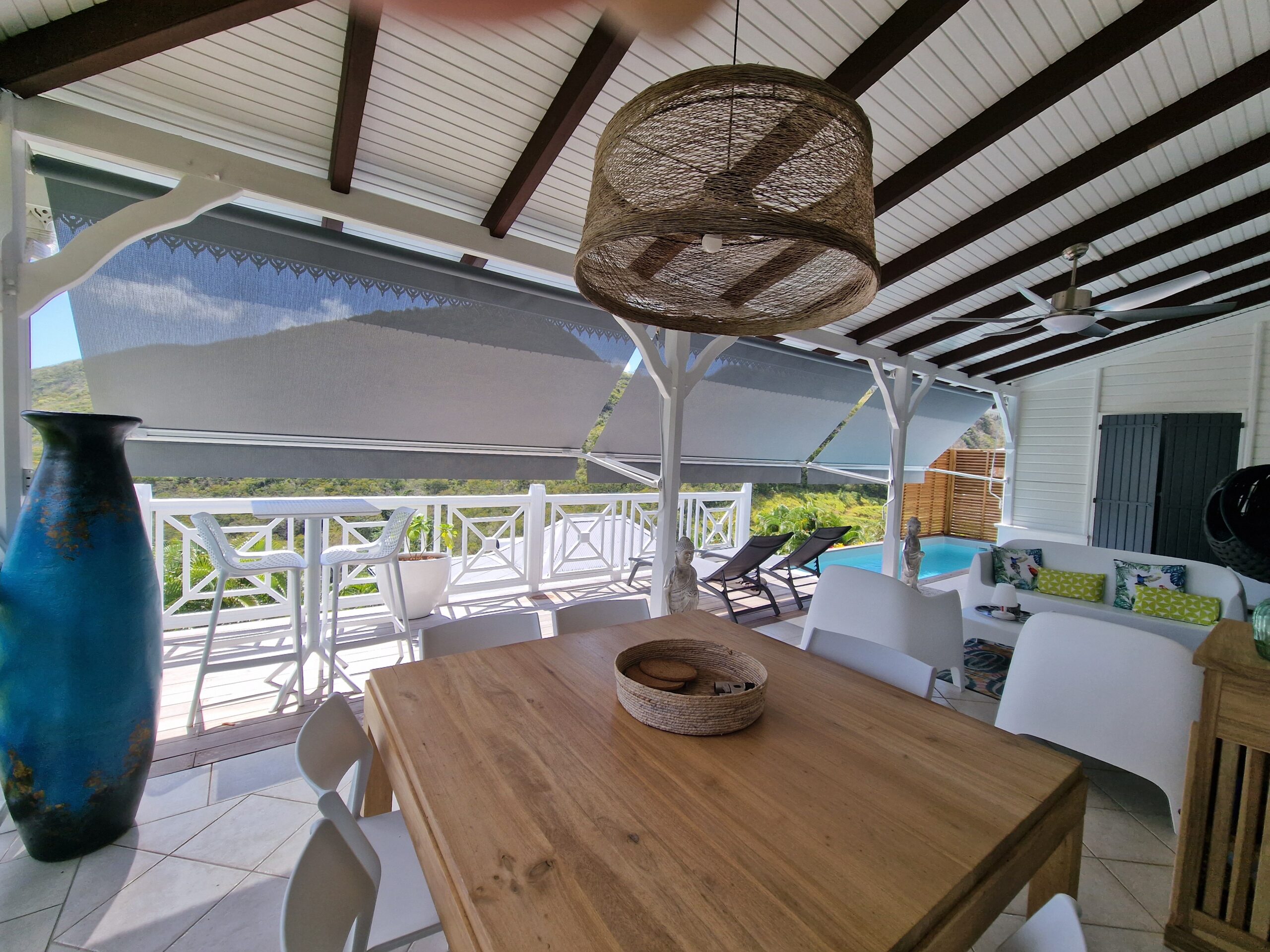 oom with its large opening onto the terrace which will offer you a panoramic view of the sea and the wooded hills, you can relax there on two comfortable fabric sofas while enjoying its cozy atmosphere. A second lounge equipped with armchairs invites you to sip a ti-punch or a local fruit juice as close as possible to this captivating view where the shades of green of the hills and blue of the sea mix, to satisfy your desire for relaxation a another “hanging egg” armchair awaits you there for even more comfort.