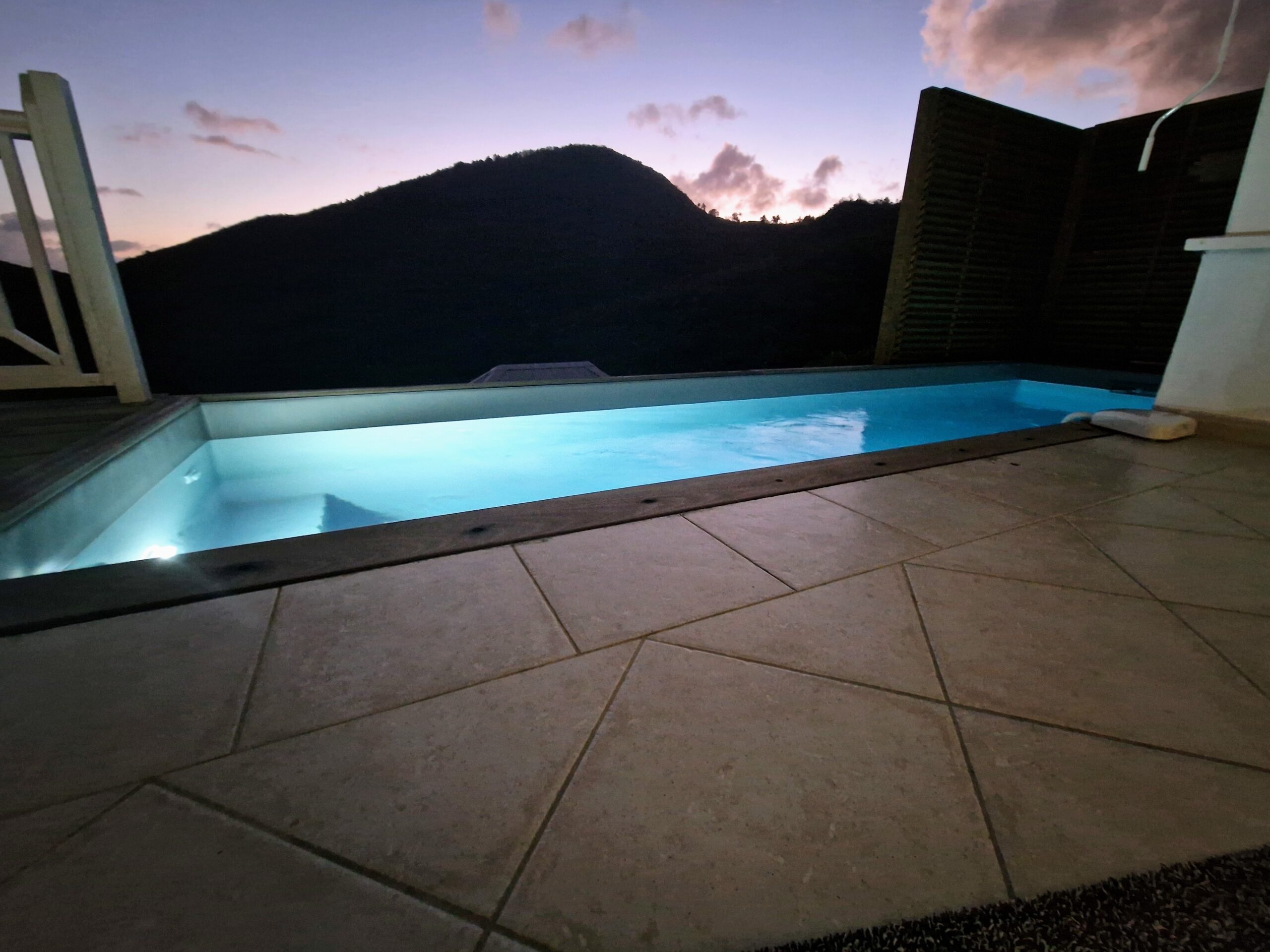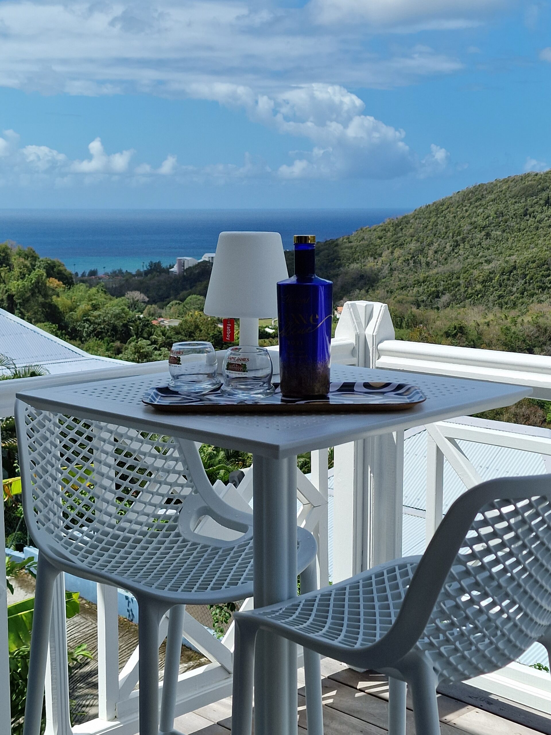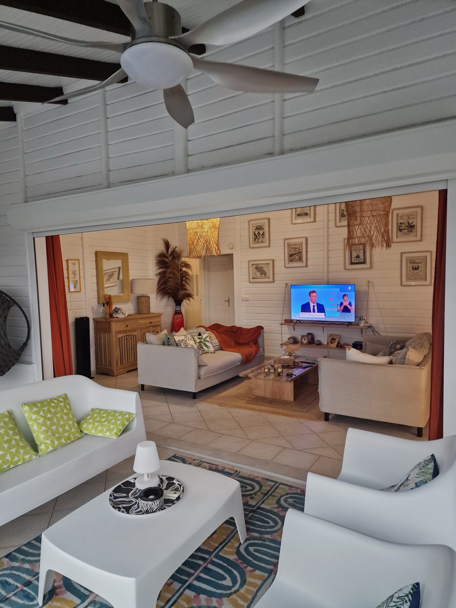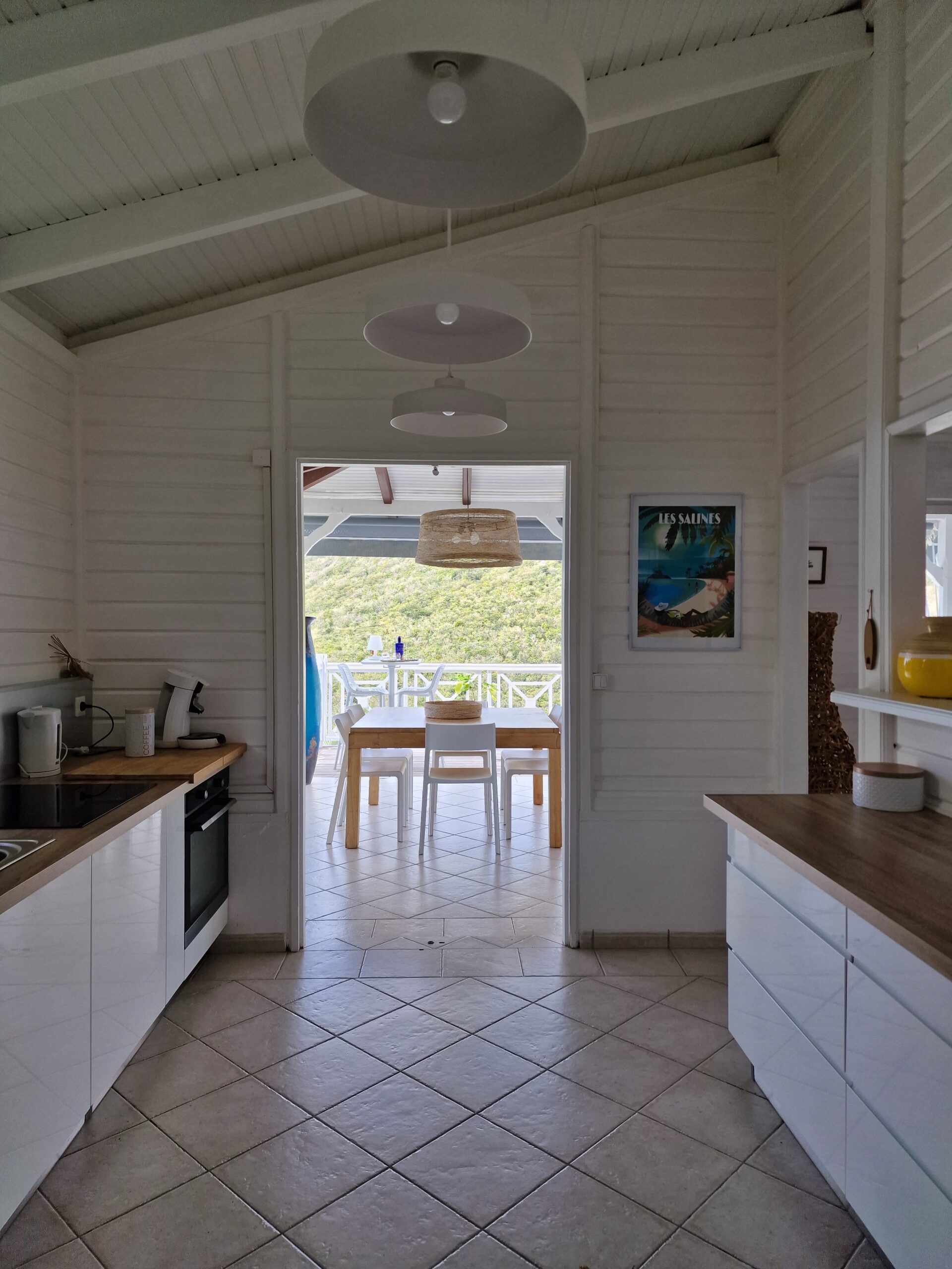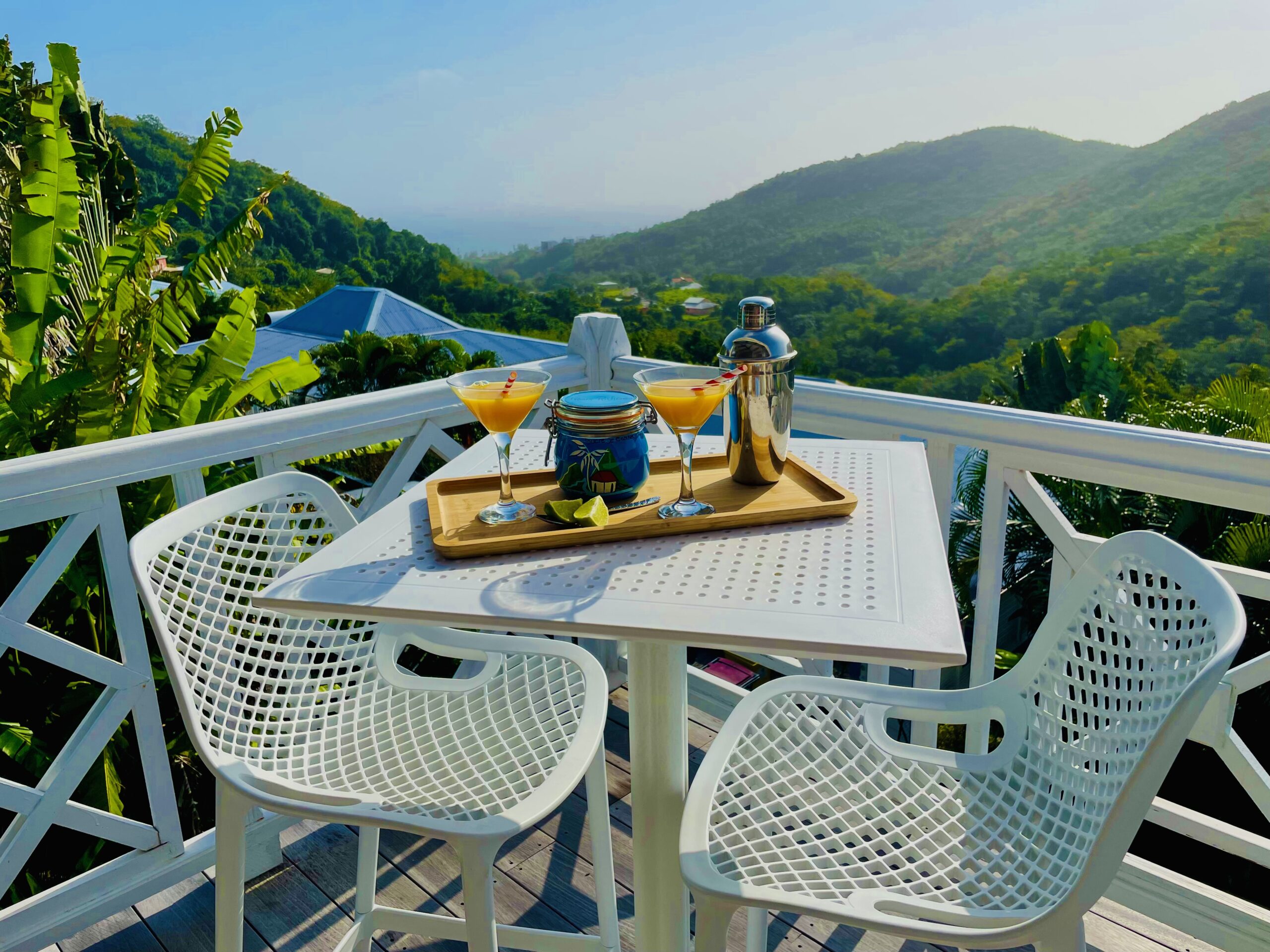 oom with its large opening onto the terrace which will offer you a panoramic view of the sea and the wooded hills, you can relax there on two comfortable fabric sofas while enjoying its cozy atmosphere. A second lounge equipped with armchairs invites you to sip a ti-punch or a local fruit juice as close as possible to this captivating view where the shades of green of the hills and blue of the sea mix, to satisfy your desire for relaxation a another “hanging egg” armchair awaits you there for even more comfort.